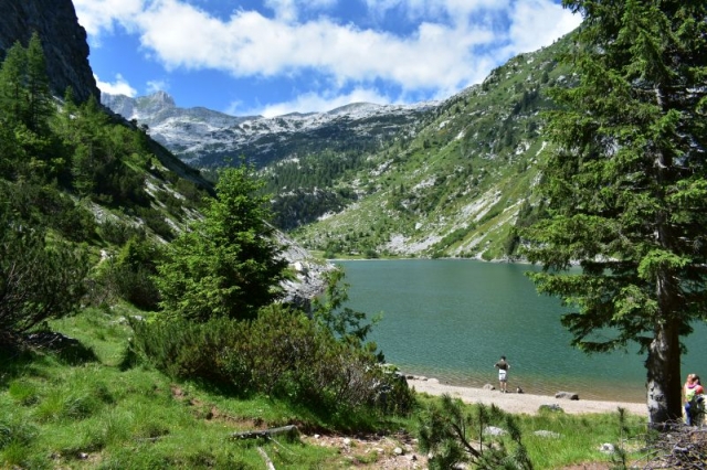 Za današnji dan je Klavdija izbrala pot v Italiji. Povedala je, da gremo do Rifugio Corsi, ker je pot zanimiva po nekih rovih. Peljali smo se čez mejni prehod Predel, moram pa povedat, da na meji ni bilo nikogar. Peljali smo se vse do Rabeljskega jezera in nato proti Sella Nevea. Od jezera naprej morate bit pozorni, na desni strani ceste na križ. Peljete se po makedamski cesti vse do zapornice. Pot naprej naprej poteka po cesti vse do planine, kjer se vam odprejo prelepi razgledi. Nato pa se vzpenjate, po ne težki poti naprej. Pot je zelo zanimiva, saj smo med potjo naleteli na padajočo vodo iz skal, kjer smo se lahko hladili in kužka sta namočila tačke. Moram povedat, ker je bilo kar precej vroče, smo naša dva kosmatinca tudi na čase nosili, da nista sama kobacala po soncu.