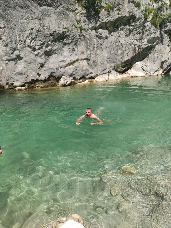 Ko smo se vračali nazaj smo poiskali med Kobaridom in Robičem Nadiška korita. Ni jih lahko najti, posebej se do njih spustiti. Tam sva se s Klavdijo tudi skopala, kar naši mami in atiji, to spet ni uspelo. Mama je nekaj poskušala, ampak ji je še Nadiža preveč mrzla. Ona je samo za mlako.
