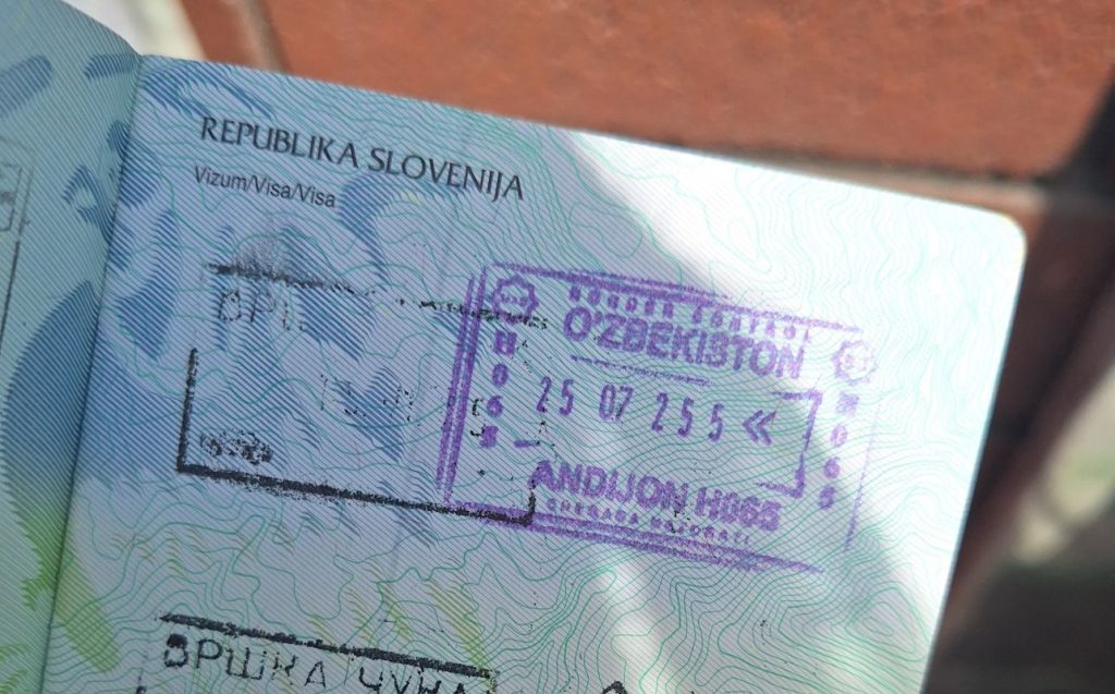 Iz Kirgizije smo vstopili v Uzbekistan na mejnem prehodu Tamozhennyy Post Dustlik. Kot vse meje do sedaj, je tudi tukaj potekalo skoraj vse isto. Ampak tukaj se je malo zataknilo. Zakaj? Ko sem vstopila z avtom v Kirgizijo, bi me morali na meji napotiti k okencu, da bi dobila papirje za uvoz avtomobila. Seveda jaz sama se tega tudi nisem spomnila, da ga nisem dobila. Tukaj takoj na kirgizijski strani so me vprašali za ta papir. Ker bi morala ta papir dati cariniku ali vojaku, saj ne vem kaj je bil. Jaz tega papirja nisem imela. Pokazal mi je za kakšen papir se gre. Ampak med vsemi papirji, ki sem jih imela že od ostalih držav, tega papirja ni bilo. Prijazen vojak je naredil na telefonu prevajalnik in mi napisal, da me ne more spustiti naprej, ker nimam papirja.